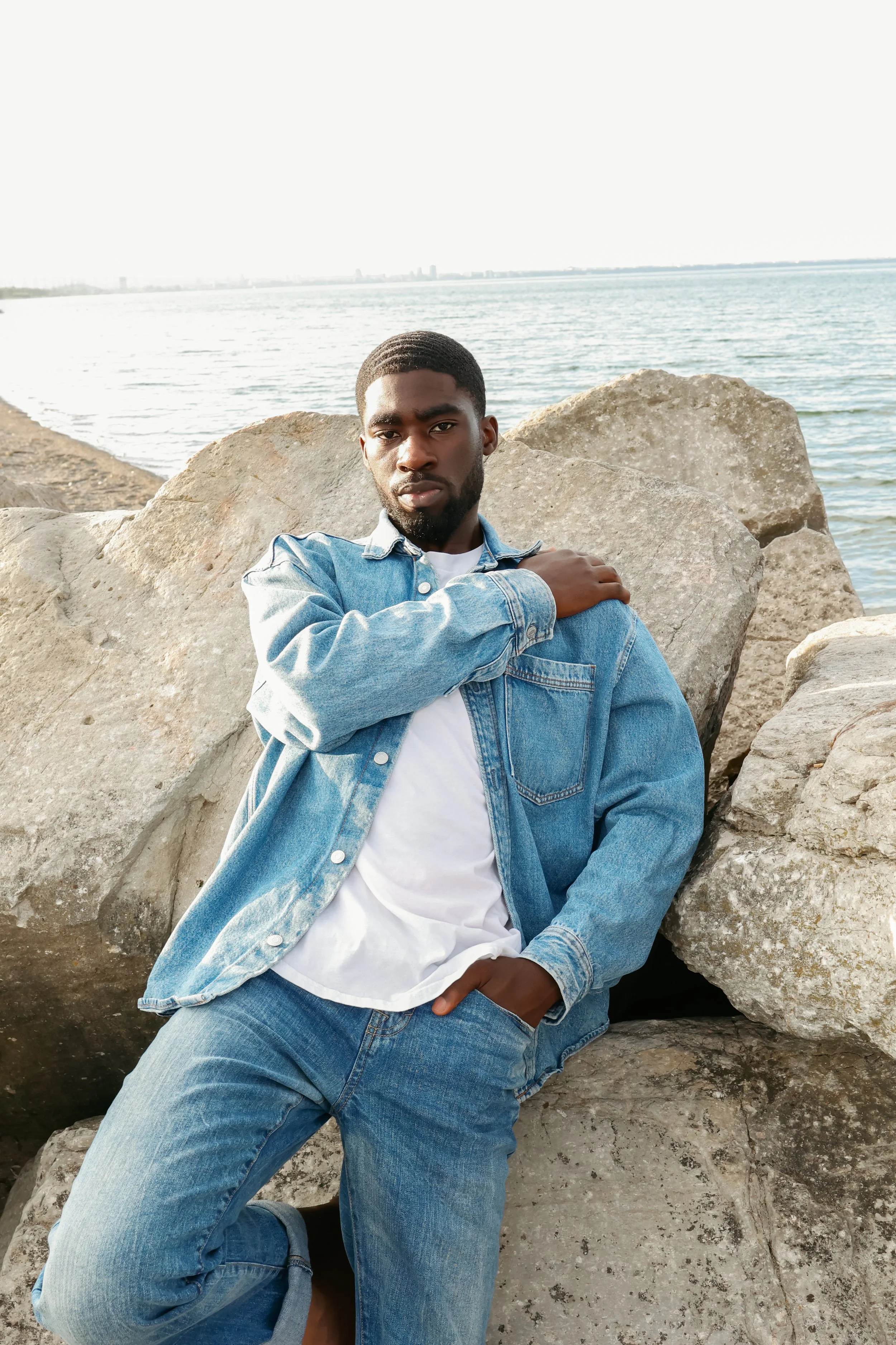 In the second look of Unwritten Water, the subject stands confidently on a beach rock, dressed in a denim button-down shirt over a white tee, paired with matching denim jeans. The images capture his poised demeanor against the rugged, steadfast rock beneath him. This setting, with its blend of natural strength and enduring style, reflects the subject’s inner resilience. Just as the rock stands firm against the elements, his presence and attire symbolize a quiet strength and unwavering solidity.